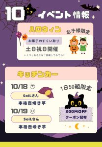 2025.10.03 10月のイベント 「トリック オア トリート🕸️🧟」 👻イベント情報のお知らせです👻 ハロウィンイベント 土日祝にご来店のお子様は お菓子すくいに挑戦できます!!!! いくつ取れるかな??? ご参加お待ちしてます✨ キッチンカーイベント 10/18(土)10/19(日)には 「SoiL」さんが来てくださいます! 本格派 壺焼き芋が食べられますよ🍂 私もおいしい焼き芋が食べられるのが、 今から楽しみです♪ みなさまのご来店お待ちしてます