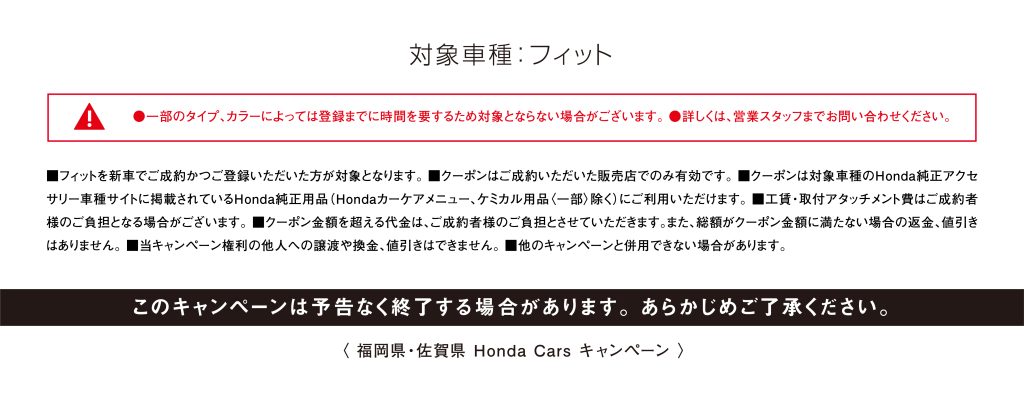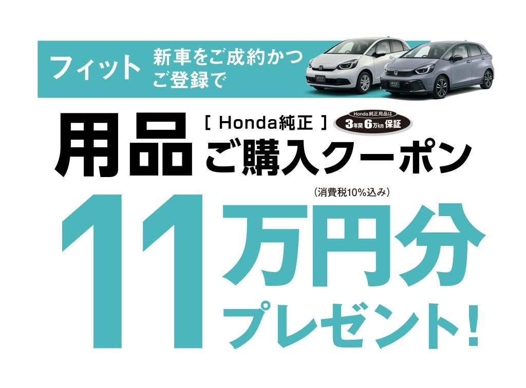 2025.10.01 キャンペーン FIT 用品購入クーポン 11万円分プレゼントキャンペーン FIT 今ならFITを新車でご成約かつご登録いただいたお客様にHonda純正 用品購入クーポン11万円分(税込)プレゼント! この機会にぜひご検討ください! 試乗車一覧はこちらから 車種情報はこちらから