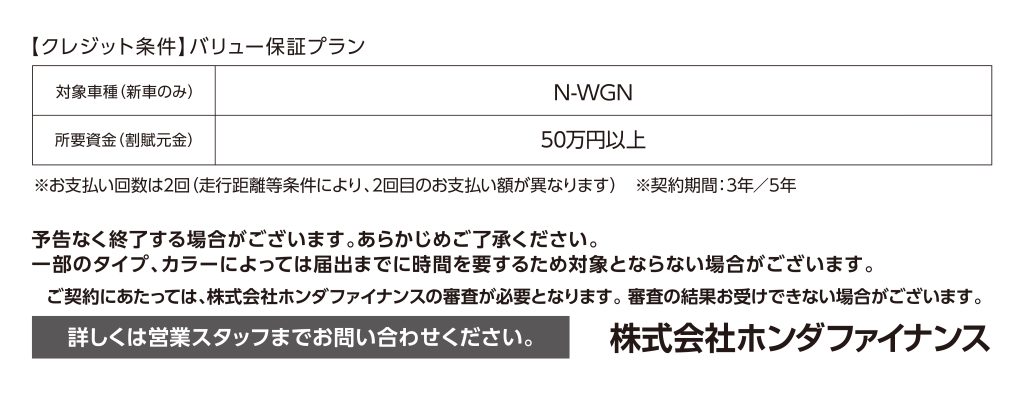 2025.12.26 キャンペーン N-WGN バリュー保証プラン 1.9%キャンペーン実施中 N-WGNご購入プラン 今ならN-WGNがバリュー保証プラン 1.9%キャンペーン中でお求めやすくなってます。詳しくは店頭にてお問い合わせください。 試乗車一覧はこちらから 車種情報はこちらから