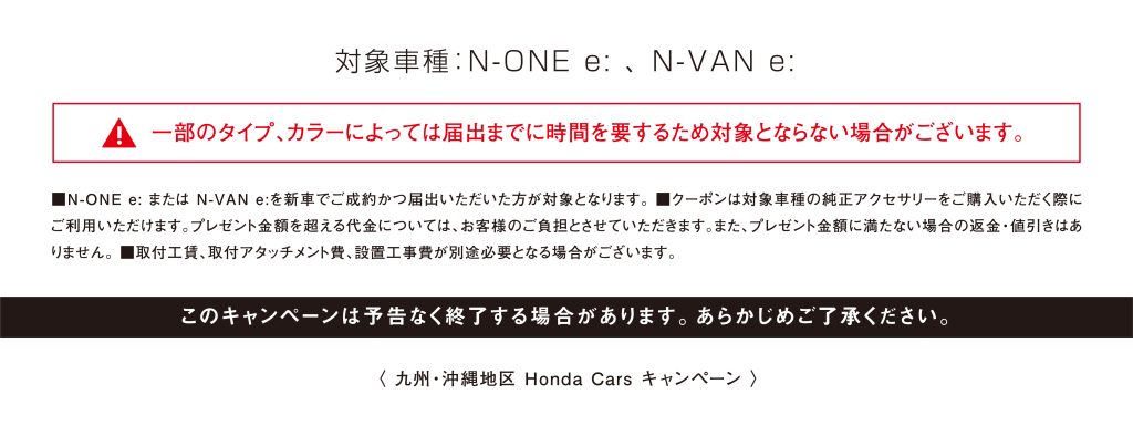 N-ONE e: または N-VAN e: Honda純正品購入クーポン 6.8万円分プレゼントキャンペーン