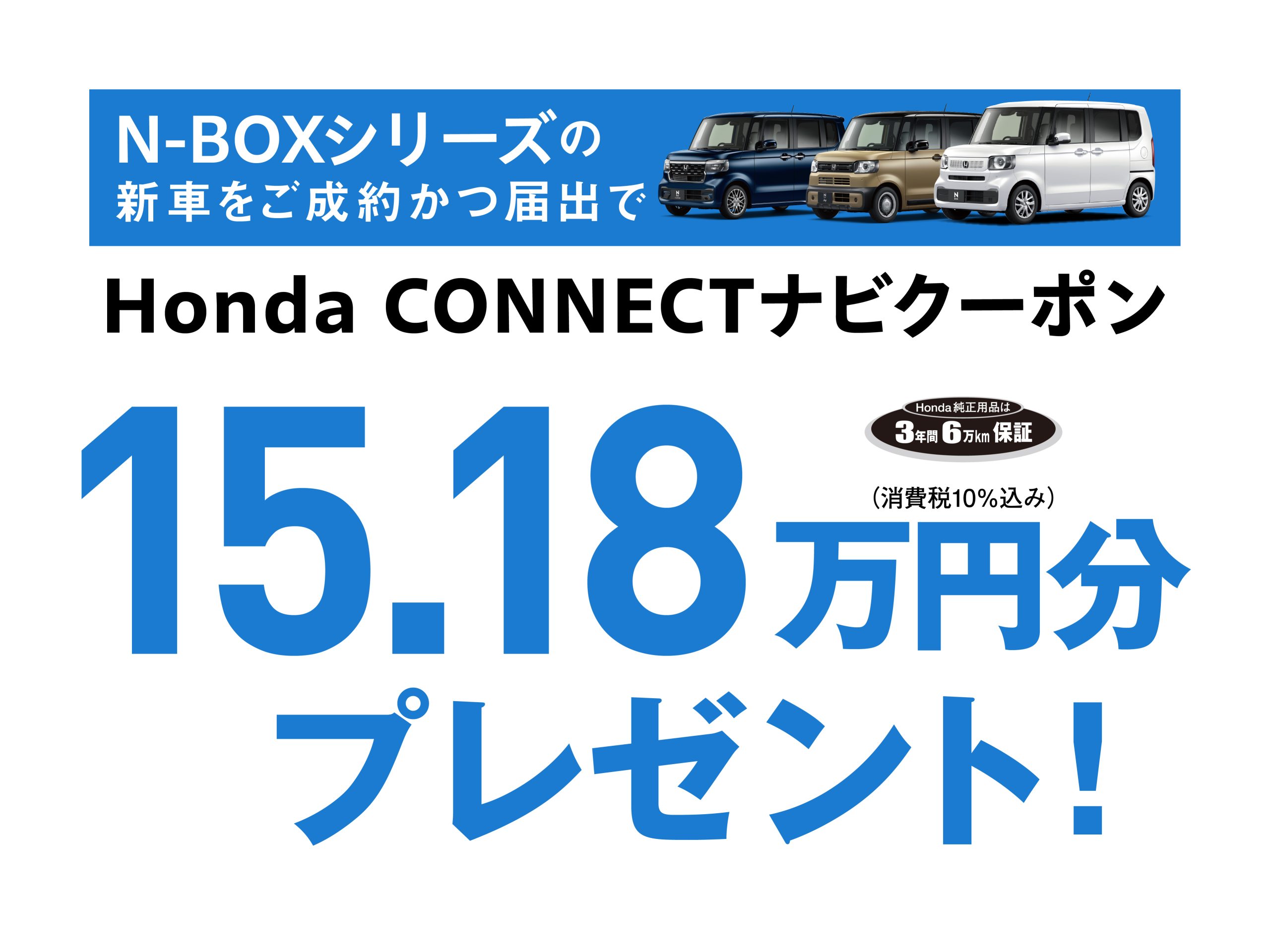 今ならN-BOX・N-BOX COSTOMを新車でご成約かつご登録(届出)いただいたお客様に Honda CONNECTナビクーポン15.18万円分(税込)プレゼント! この機会にぜひご検討ください!