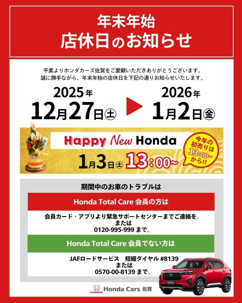 2025.12.22 お知らせ 年末年始営業について 2025年も残すところあとわずかとなりました。 ホンダカーズ佐賀、年末年始の営業についてご案内です。 2025年12月27日(土)~2026年1月2日(金)までをお休みとさせていただきます。 期間中のトラブルは下記までご連絡ください。 ホンダトータルケア 0120-995-999 JAF 0570-00-8139 2026年1月3日(土)13時~より初売りとなります。